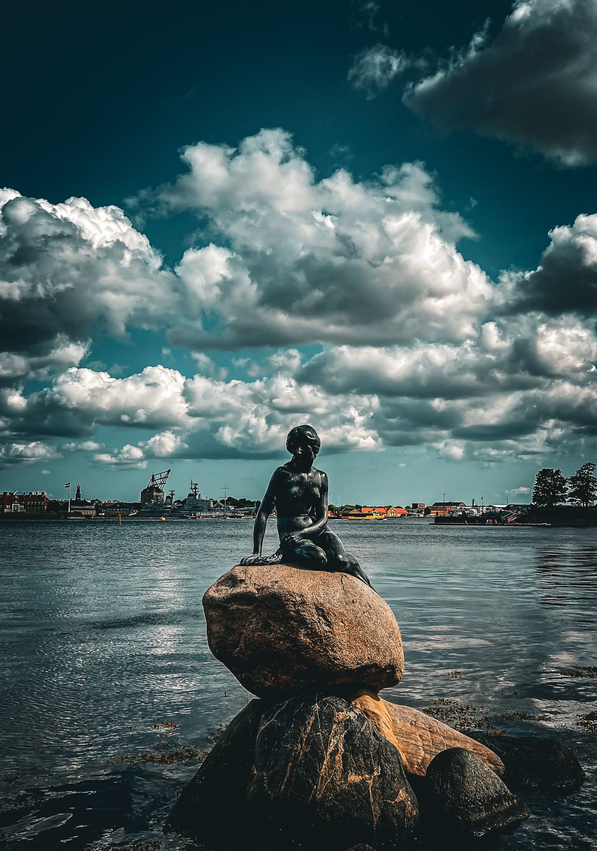Die Kleine Meerjungfrau sitzt still auf einem Felsen am Hafen von Kopenhagen, den Blick auf das Wasser gerichtet. Die Bronzefigur wirkt zart und verletzlich, während das gedämpfte Licht und die ruhige See eine melancholische, fast kontemplative Stimmung erzeugen. Sie symbolisiert Sehnsucht, Träume und die stille Kraft des Wartens – ein ikonischer Moment zwischen Mensch und Meer.