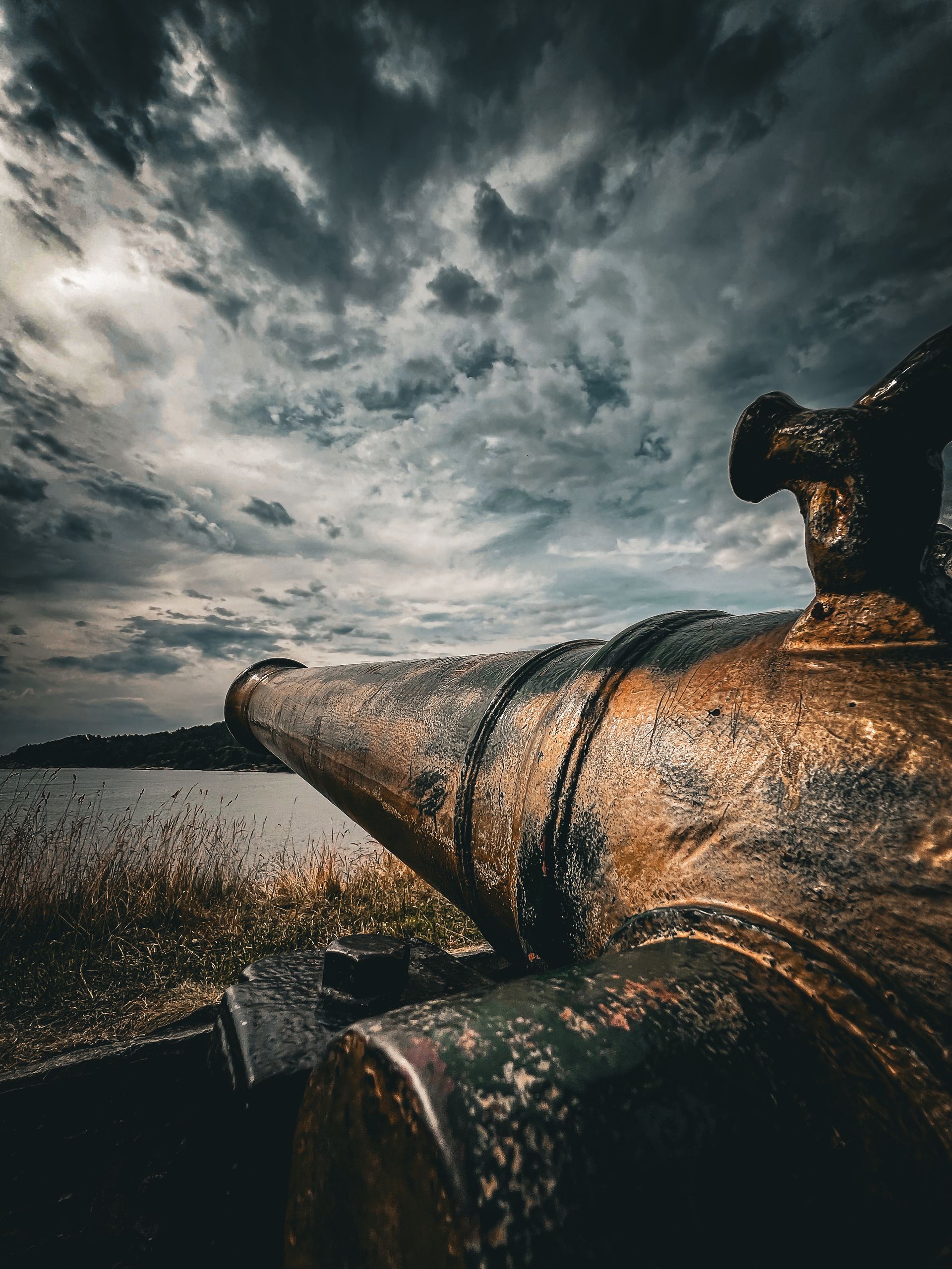 Eine alte Kanone steht auf der Küste von Kristiansand, fest auf ihrem Sockel gerichtet in Richtung Meer. Der massive Stahlkörper, von Wind und Wetter gezeichnet, vermittelt Kraft, Wachsamkeit und die historische Bedeutung des Ortes als Verteidigungspunkt. Das gedämpfte Licht, Wolken und das raue Küstenpanorama verstärken die dramatische, fast melancholische Atmosphäre, als würde die Kanone still die Vergangenheit beobachten und zugleich die Weite der Nordsee bewachen.