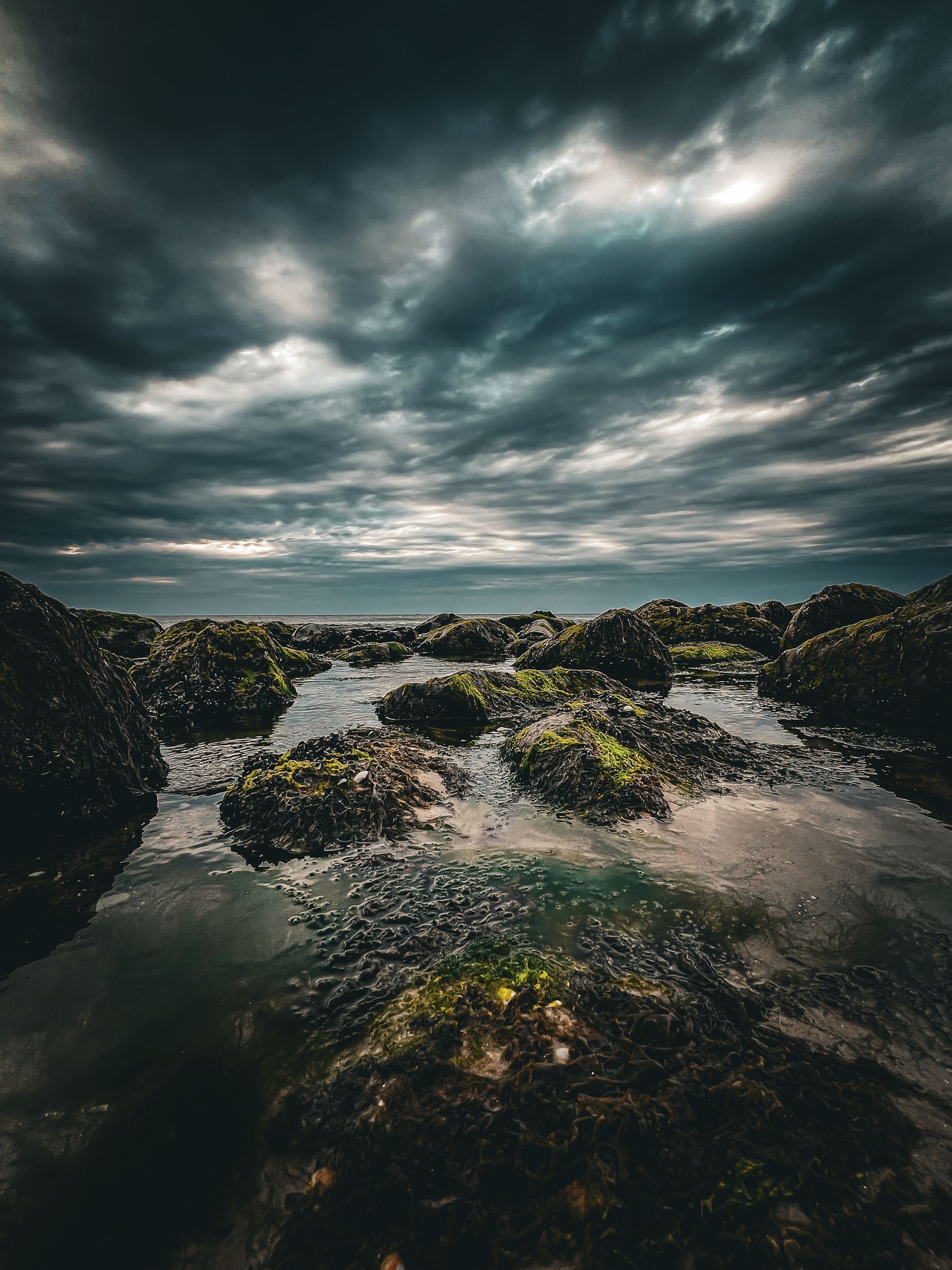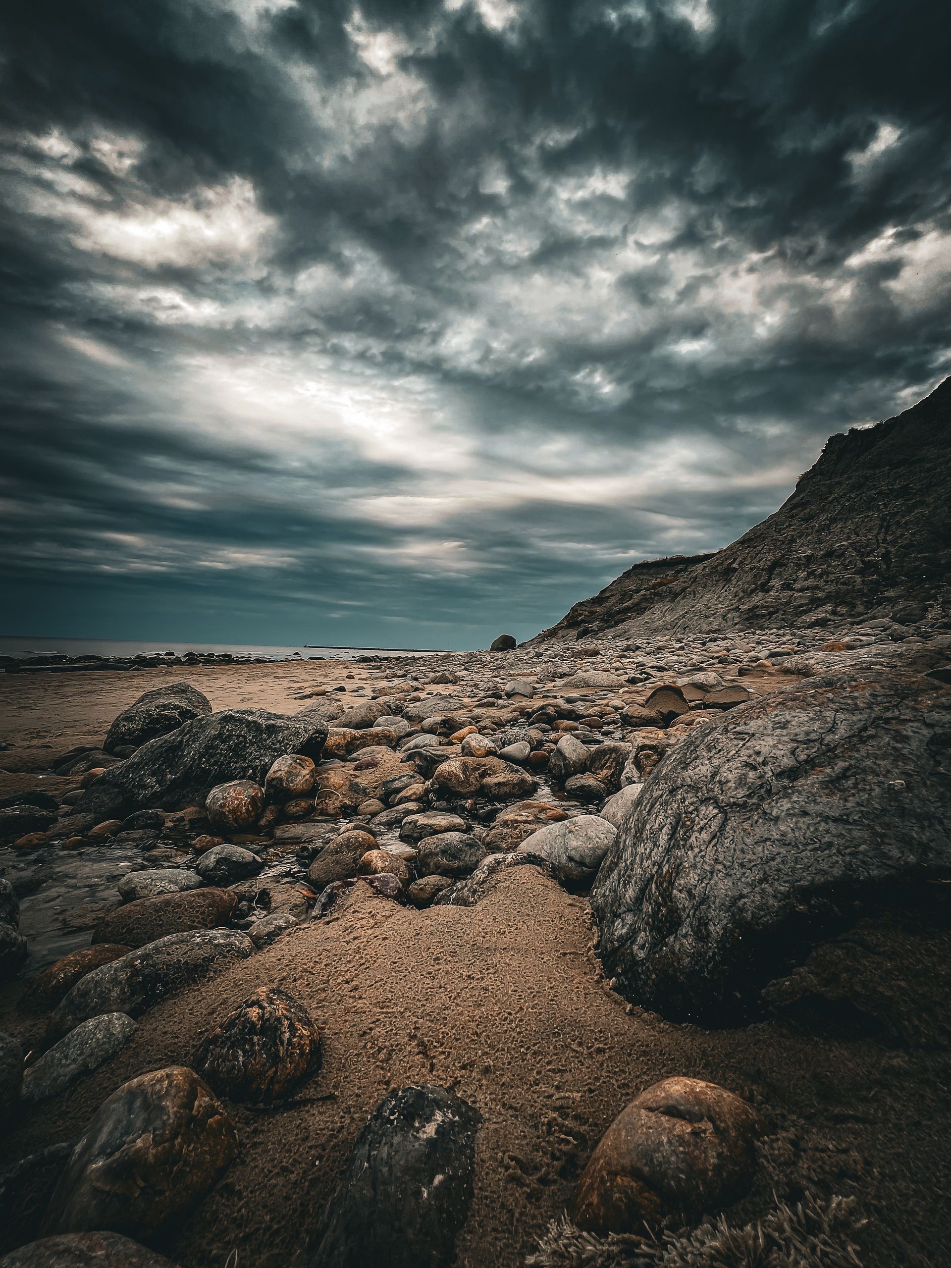 Am Strand von Hirtshals liegen grobe Steine in unregelmäßiger Anordnung, vom Wind und den Gezeiten geformt. Das gedämpfte Licht, der graue Himmel und die kühle Nordseeluft verleihen der Szene eine ruhige, fast mystische Atmosphäre. Die Steine wirken zeitlos, geerdet und unerschütterlich – stille Zeugen des Meeres, das unaufhörlich an ihnen arbeitet. Die Komposition vermittelt Ruhe, Isolation und die raue Schönheit der Küstenlandschaft.