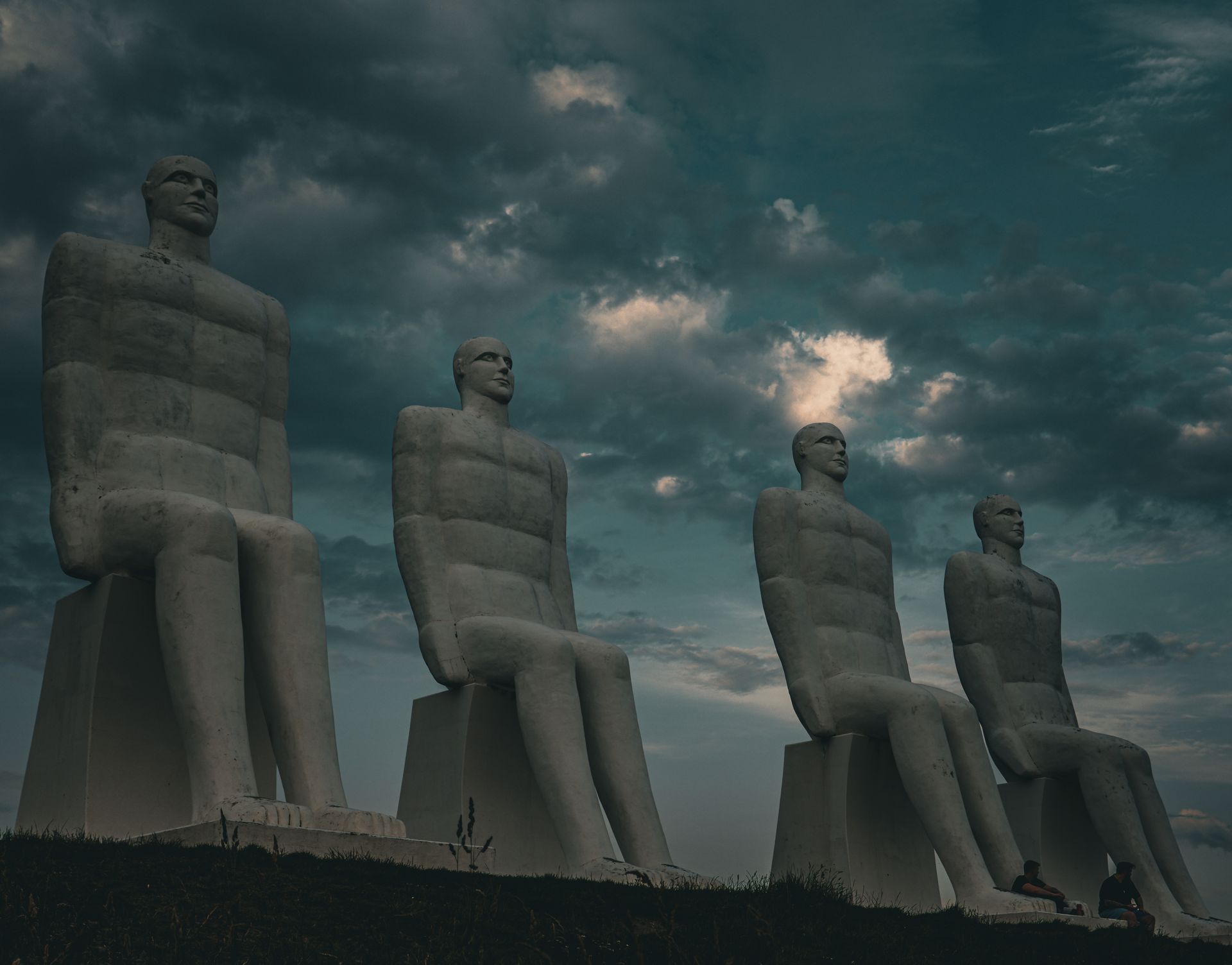 „Mensch am Meer“ ist eine monumentale, neun Meter hohe Skulpturengruppe an der Küste von Esbjerg in Dänemark. Vier weiße, sitzende Figuren blicken still auf die Nordsee. In ihrer klaren Form und reduzierten Haltung wirken sie zugleich zeitlos und kontemplativ. Wind, Licht und Weite verstärken den Eindruck von Ruhe, Erwartung und stiller Beobachtung – der Mensch als Teil einer größeren Landschaft.