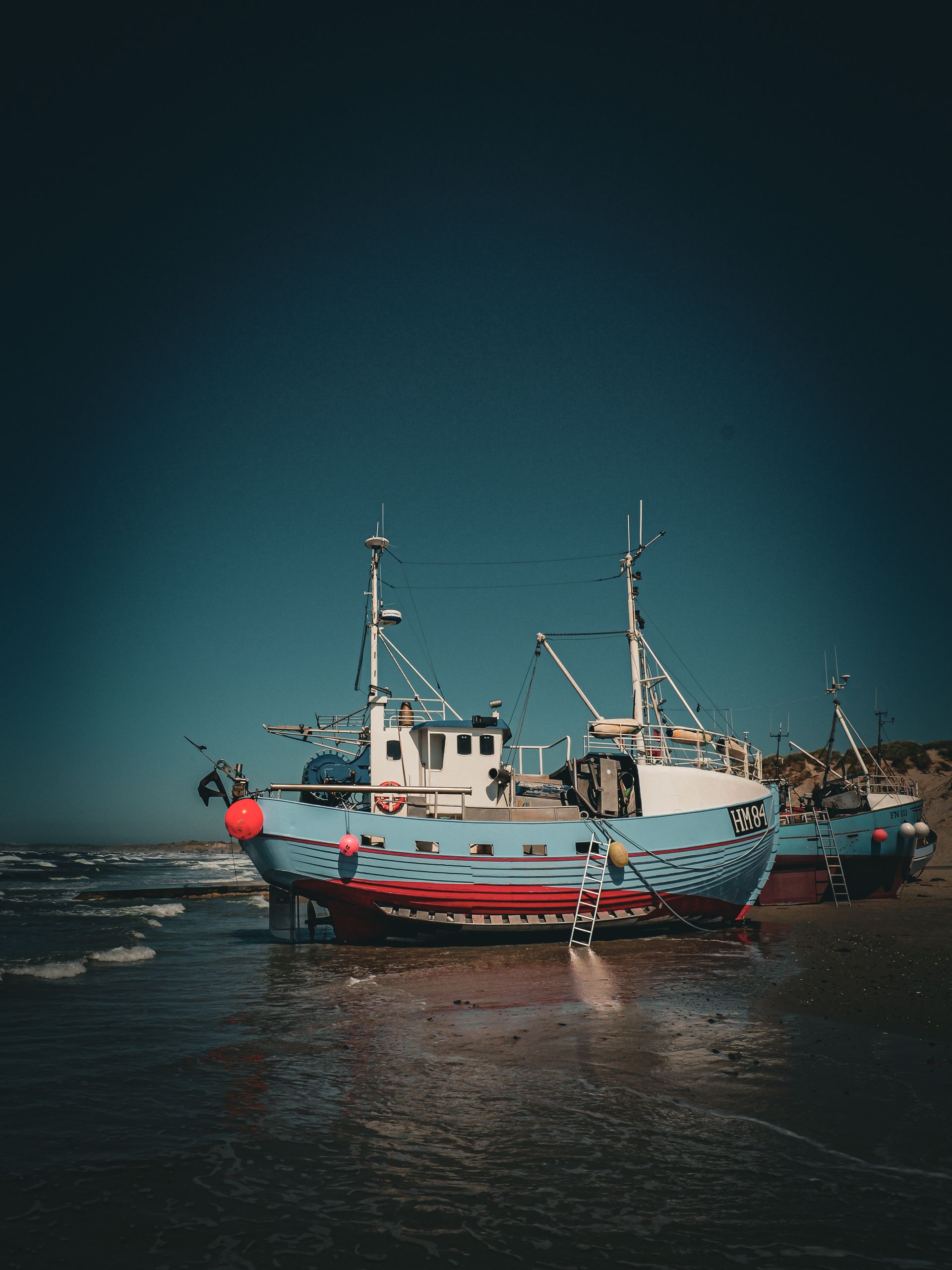 Am Løkken Strand liegen die typischen, kleinen, blauen Fischerboote auf dem Sand, vom Wind leicht verschoben und vom Meer gezeichnet. Der peelingartige Lack und die raue Oberfläche erzählen von harten Arbeitstagen auf der Nordsee. Gedämpftes Licht und das stille Rauschen der Wellen verstärken die ruhige, leicht melancholische Stimmung. Die Szene wirkt wie ein Moment der Ruhe zwischen zwei Einsätzen, eingefangen zwischen Meer, Strand und Himmel.